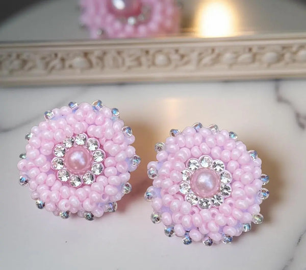 Beaded small pink rose earrings