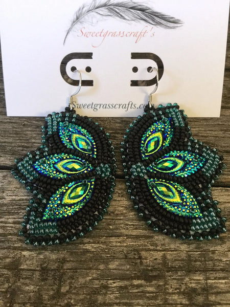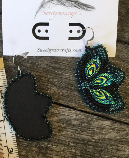 They are done with translucent teal luster & matte black seed bead to set off the peacock blue green gems, Italian leather backing & stainless steel shepherds hook
