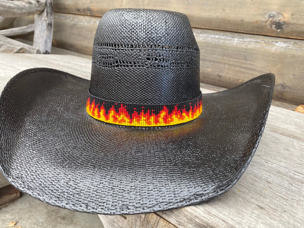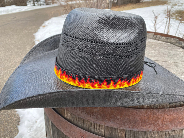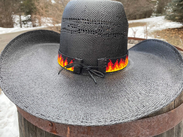 Thousands of seedbeads in red, yellow and orange in a unique hatband accented with black matte seed bead making this a great looking hatband.