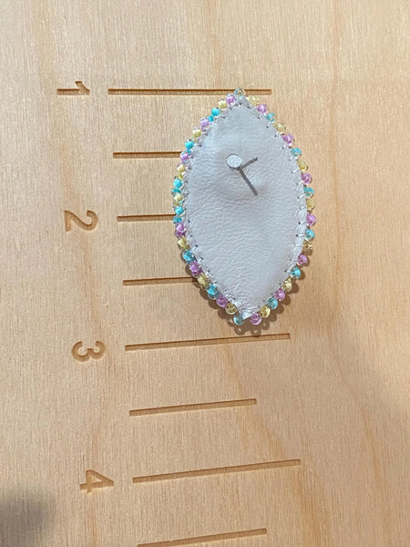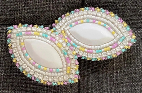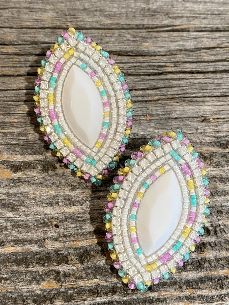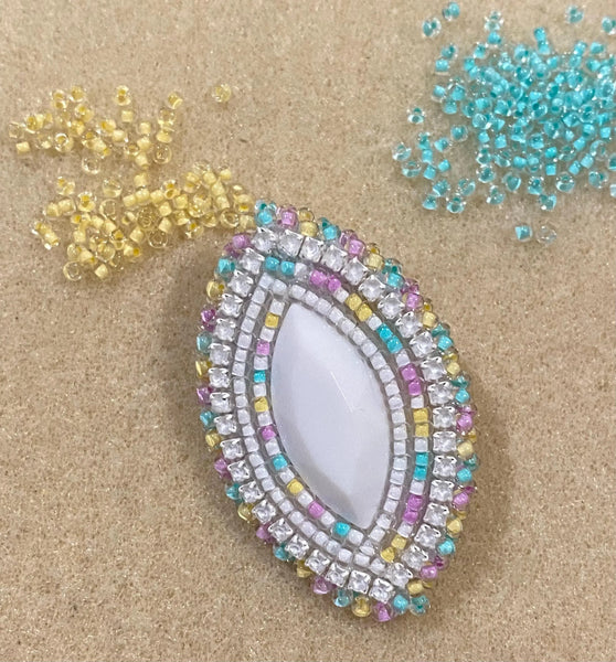 Each piece features a smooth white marquise-shaped cabochon surrounded by intricately hand-stitched seed beads in pastel pink, yellow, aqua, and lilac and a row of white rhinestone chain for a pop of sparkle.