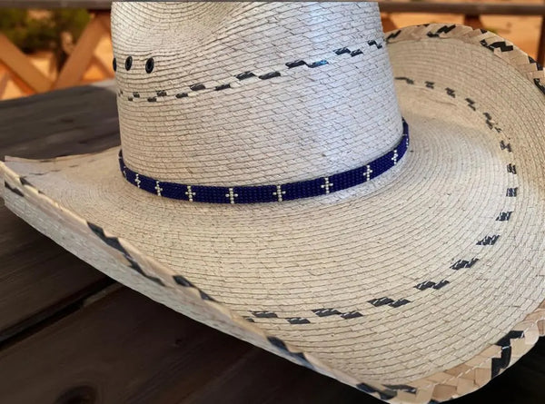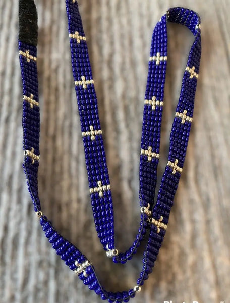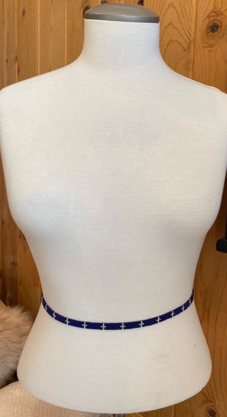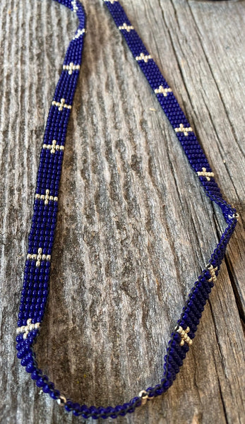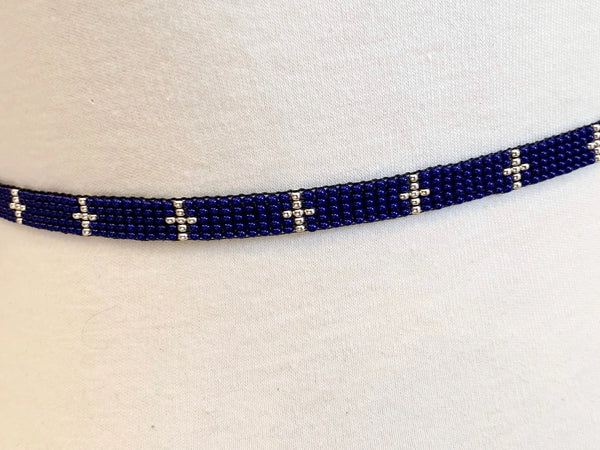Done in royal blue & silver glass seed beads, this is a stunning hatband.