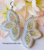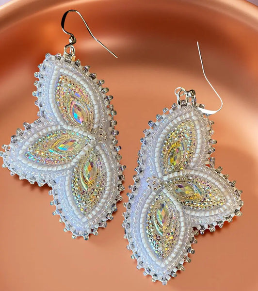 These stunning crisp white earrings are done with clear iris rainbow & white lined clear bead to set off the white sparkling gems, leather backing & stainless steel shepherds hook