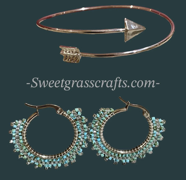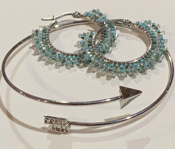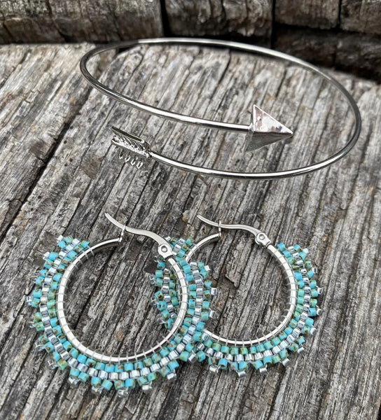 A shiny arrow bangle to point you in the right direction & beaded hoops that dance with turquoise & crystal shimmer.