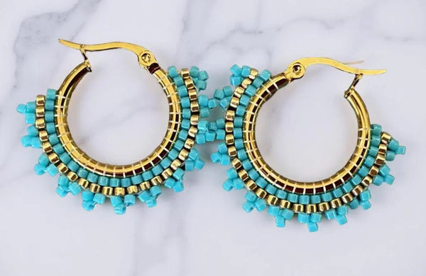Hand-beaded with gleaming gold accents, they strike the perfect balance between bold and elegant, lightweight and versatile, these hoops are ideal for everyday wear or dressing up your favorite outfit.