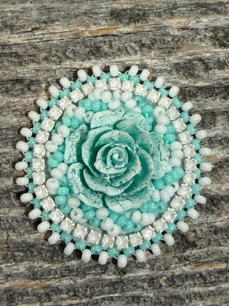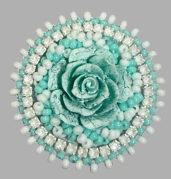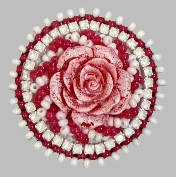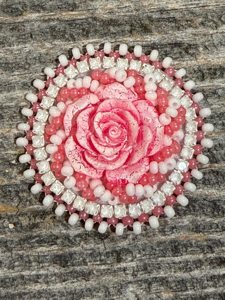 This handcrafted crackle rose badge reel features layered beads and sparkling rhinestones for a soft, feminine touch.