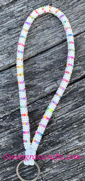 This eye-catching accessory is perfect for holding your essentials while keeping your hands free, crafted from frosted neon & white glass seed beads that add a playful pop of color to any outfit.