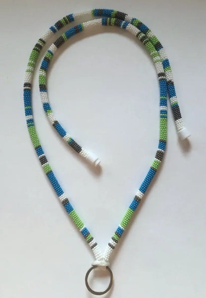 Soft green & blue glass seed bead lanyard that is approximately 21"inches long.