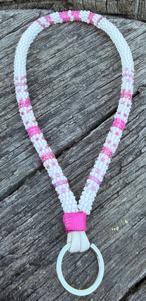 Add a pop of color to your keys with this handmade pink and white beaded wristlet keychain.