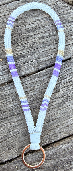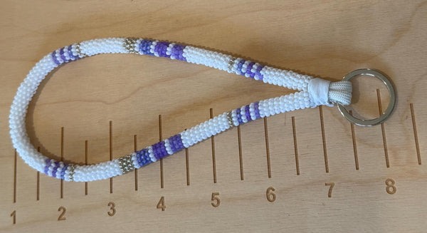 Carefully woven with durable seed beads in soft white, lavender, and silver accents, this lightweight wristlet slips comfortably over your wrist so you can carry keys hands-free.
