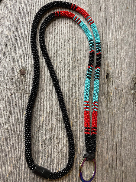 This Turquoise green, red and black seed bead lanyard comes with a key chain making it very useful, it can hold keys, ID badges.