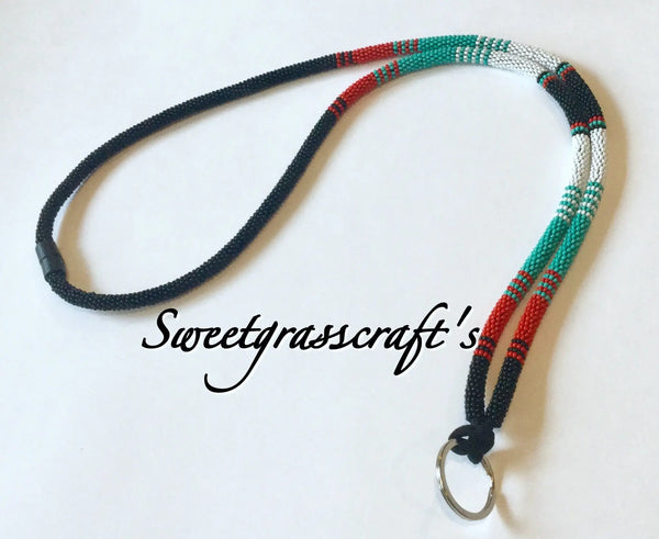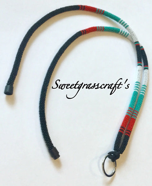This is a unisex beautifully wrapped safety/ breakaway seed bead lanyard that is approximately 21” inches long.