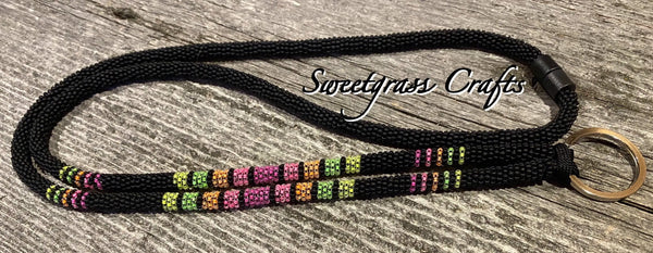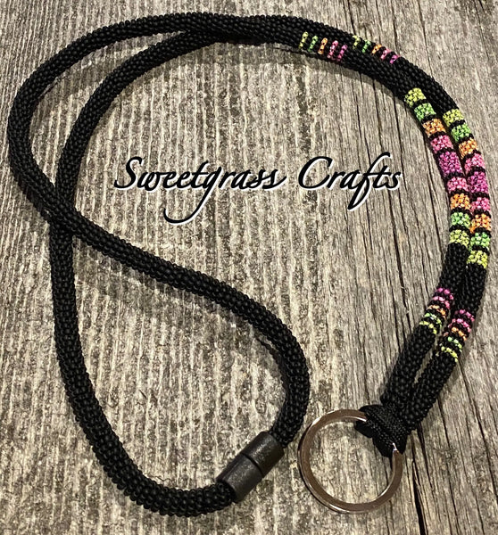 This multi shaded neon & black matte bead wrapped lanyard holds a keychain making it very useful, it can hold keys, ID badges, event passes as well as reading glasses.