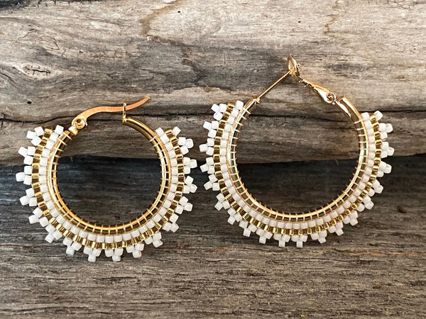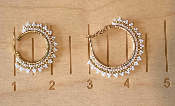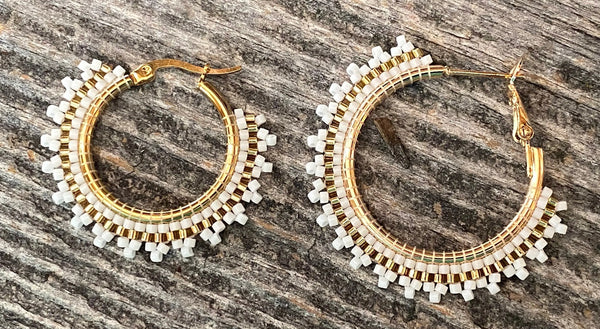 These earrings are done in brick stitch with shimmering gold & white delica bead