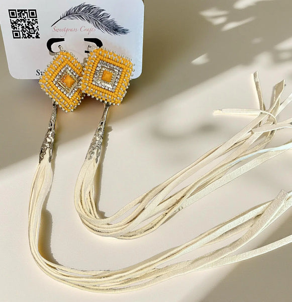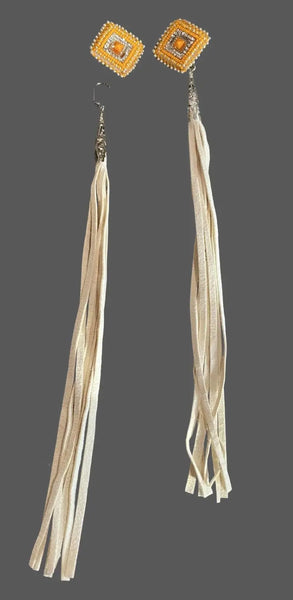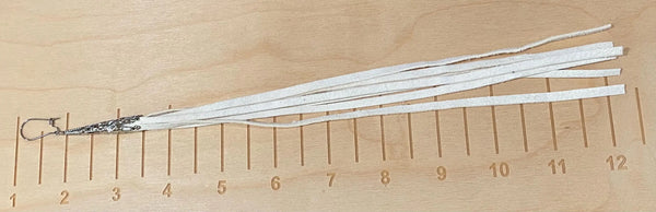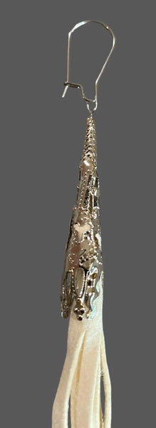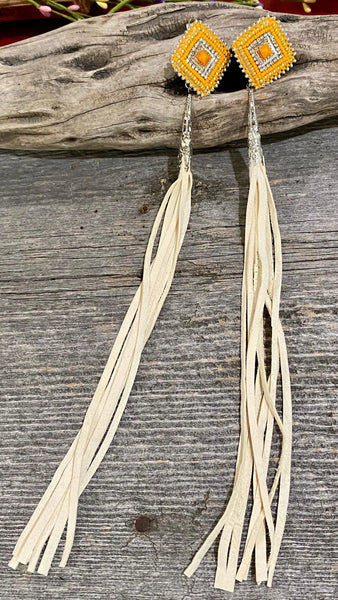 3 in 1 earrings 12” long cream leather fringe earrings, long buckskin fringe earrings