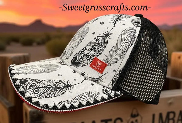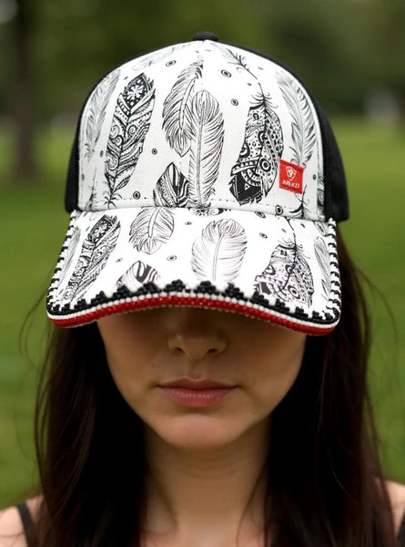 The cap itself features Ariat’s signature quality and comfort, with a bold black-and-white feather design that adds striking visual appeal.
