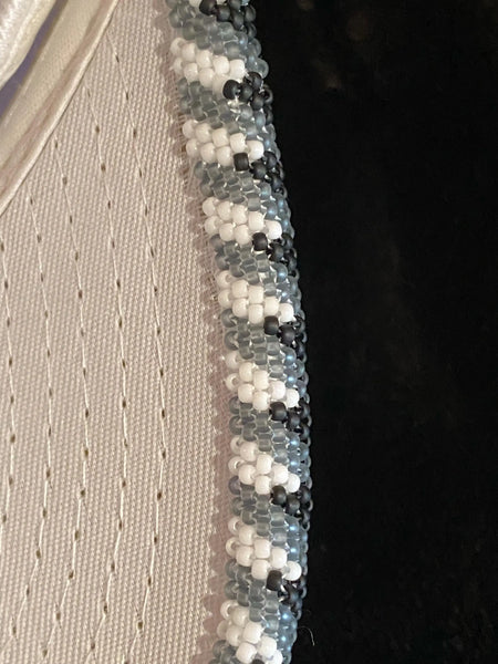 This beautiful hat is hand woven peyote stitched 1 bead at a time in a stylish pattern to make this hat a wearable work of art, Hook & loop (Velcro) back closing tab.