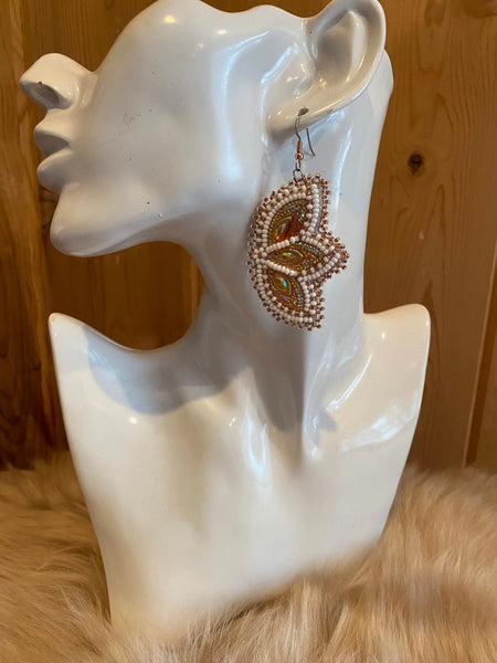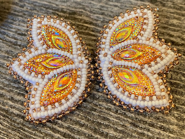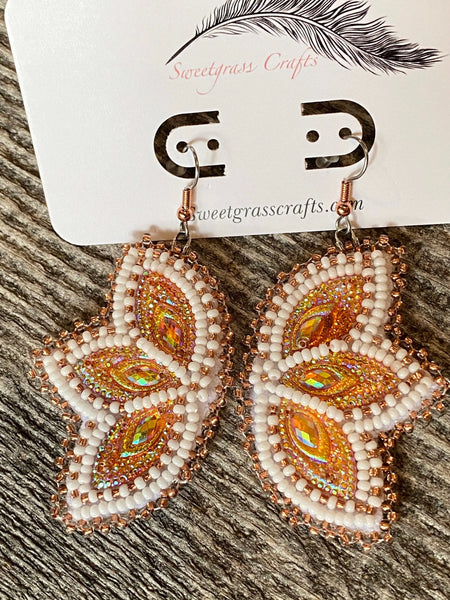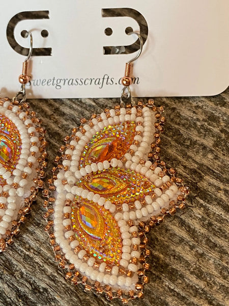 These dramatic eye catching earrings are done with white & copper lined seed bead to set off the yellow gems, leather backing & post backing
