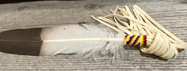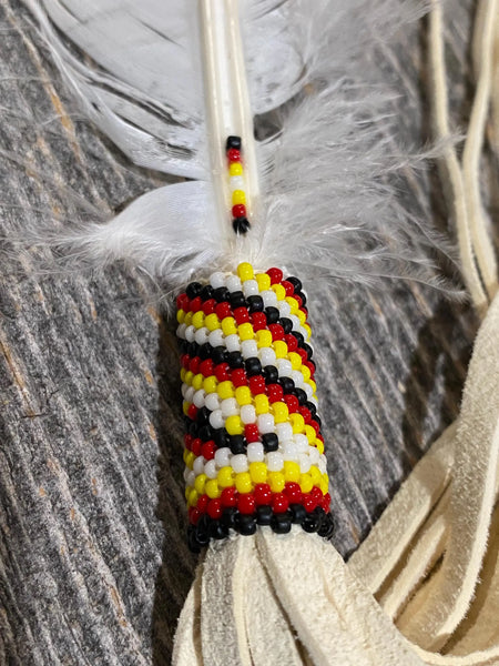 Handcrafted with a hand dyed feather adorned with vibrant Toho seed beads in traditional medicine wheel colors, this feather is not only a beautiful addition to your spiritual practice but also carries powerful energy cleansing properties.