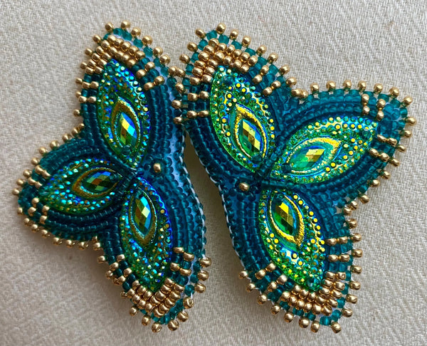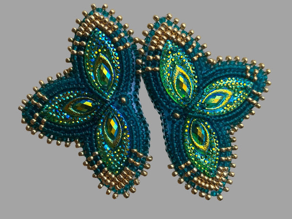 These dramatic eye catching earrings are done with teal transparent & gold seed bead to set off the peacock green gems, Italian leather backing