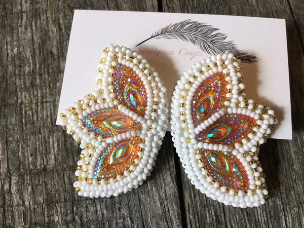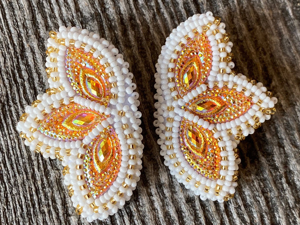 Yellow beaded earrings, Indigenous beaded orange butterfly earrings, white earrings Powwow earrings